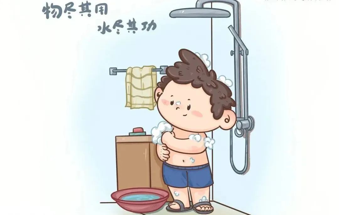 节水:间断放水淋浴,搓洗时及时关水,避免过长时间冲淋。盆浴后的水可用于洗衣、洗车、冲洗厕所、拖地等。