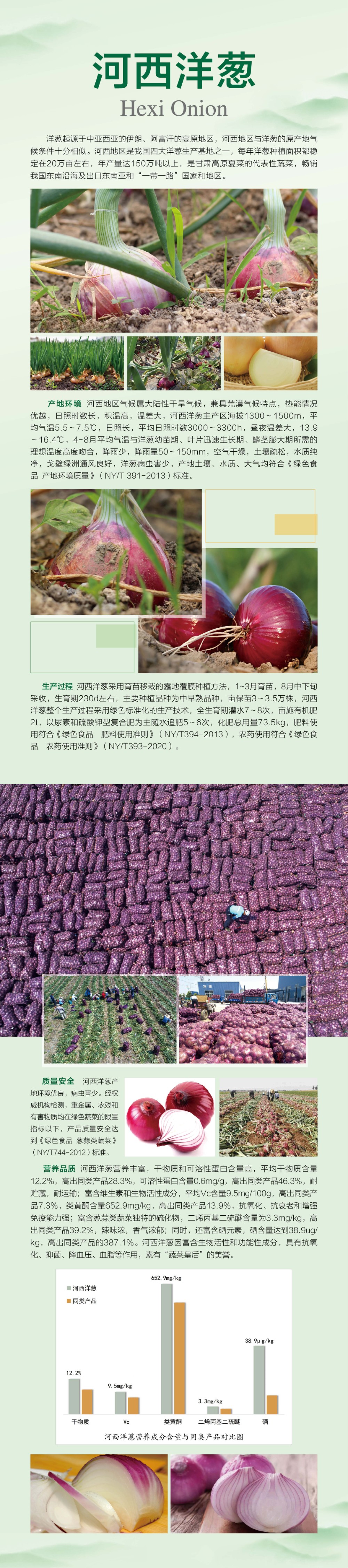河西洋葱营养丰富,干物质和可溶性蛋白含量高,平均干物质含量12.2%,高出同类产品28.3%,可溶性蛋白含量0.6mg/g,高出同类产品46.3%,耐贮藏,耐运输;富含维生素和生物活性成分,平均Vc含量9.5mg/100g,高出同类产品7.3%,类黄酮含量652.9mg/kg,高出同类产品13.9%,抗氧化、抗衰老和增强免疫能力强;富含葱蒜类蔬菜独特的硫化物,二烯丙基二硫醚含量为3.3mg/kg,高出同类产品39.2%,辣味浓,香气浓郁;同时,还富含硒元素,硒含量达到38.9ug/kg,高出同类产品的387.1%。