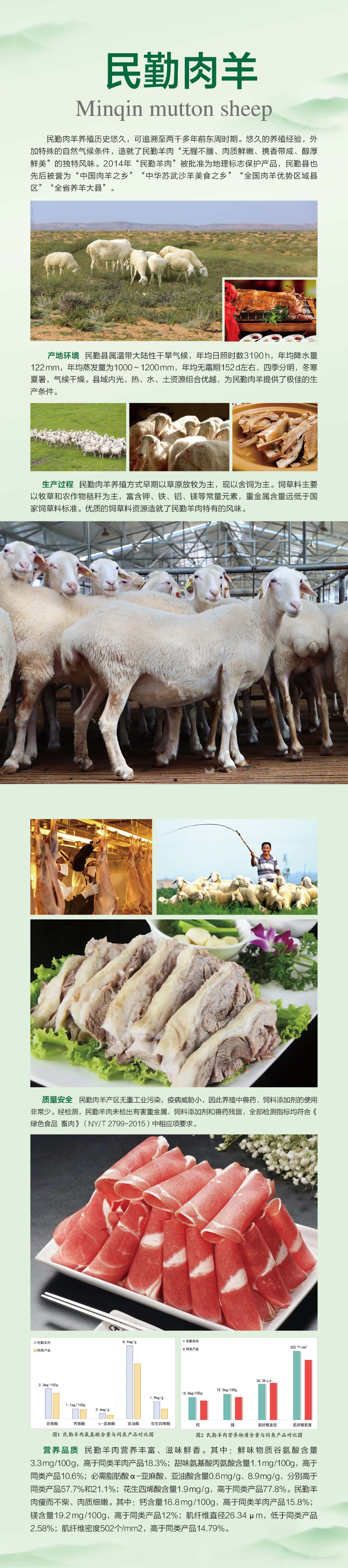 民勤羊肉营养丰富、滋味鲜香。其中:鲜味物质谷氨酸含量3.3mg/100g,高于同类羊肉产品18.3%;甜味氨基酸丙氨酸含量1.1mg/100g,高于同类产品10.6%;必需脂肪酸α-亚麻酸、亚油酸含量0.6mg/g、8.9mg/g,分别高于同类产品57.7%和21.1%;花生四烯酸含量1.9mg/g,高于同类产品77.8%。民勤羊肉瘦而不柴、肉质细嫩。其中:钙含量16.8mg/100g,高于同类羊肉产品15.8%;镁含量19.2mg/100g,高于同类产品12%;肌纤维直径26.34μm,低于同类产品2.58%;肌纤维密度502个/mm2,高于同类产品14.79%。