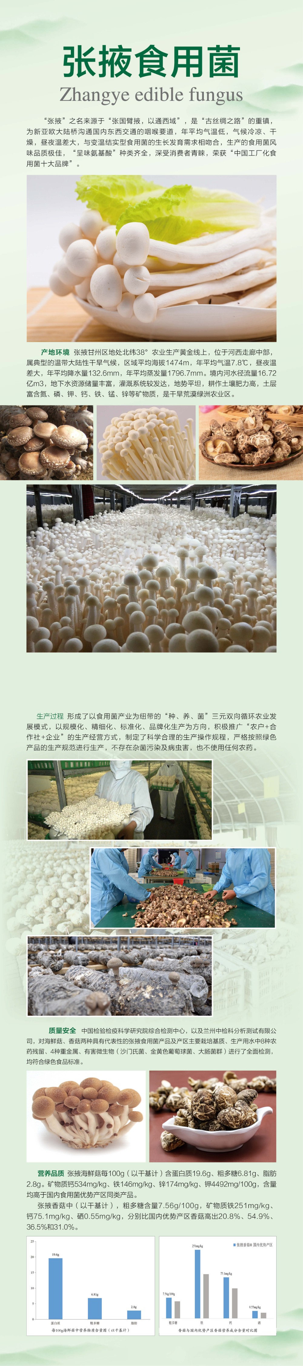 张掖食用菌营养丰富,蛋白质、多糖、矿物质含量高,脂肪含量低,氨基酸种类丰富,符合人们追求的理想食品的营养组成。张掖海鲜菇每100g (以干基计)含蛋白质19.6g、粗多糖6.81g、脂肪2.8g。矿物质钙534mg/kg、铁146mg/kg、锌174mg/kg、钾4492mg/100g,含量均高于国内食用菌优势产区同类产品。