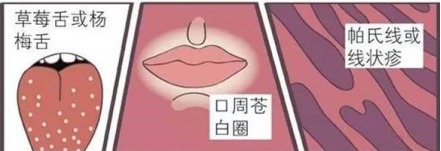 3、出疹期:大多在发病12-36小时内出现皮疹,个别可延缓到2天以后,皮疹呈猩红色细小丘疹,疹间皮肤潮红,压之褪色,皮肤皱褶处出现“帕氏症”,面部充血无皮疹,口周则不充血,呈现“口周苍白圈”。