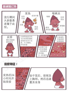 猩红热(scarlet fever)为A组溶血性链球菌感染引起的急性呼吸道传染病。中医称之为“烂喉痧”。其临床特征为发热、咽峡炎、全身弥漫性鲜红色皮疹和皮疹消退后明显的脱屑。少数患者在患病后,由于变态反应而出现心、肾、关节的损害。本病一年四季都有发生,尤以冬春之季发病为多。患者和带菌者是主要传染源,经由空气飞沫传播,也可经由皮肤伤口或产道感染。发病年龄以3-8岁小儿为主,6个月以内婴儿因从母体获得被动免疫力,故很少发病。由于易感人群常较为集中,猩红热疫情多发生在托幼机构和小学。