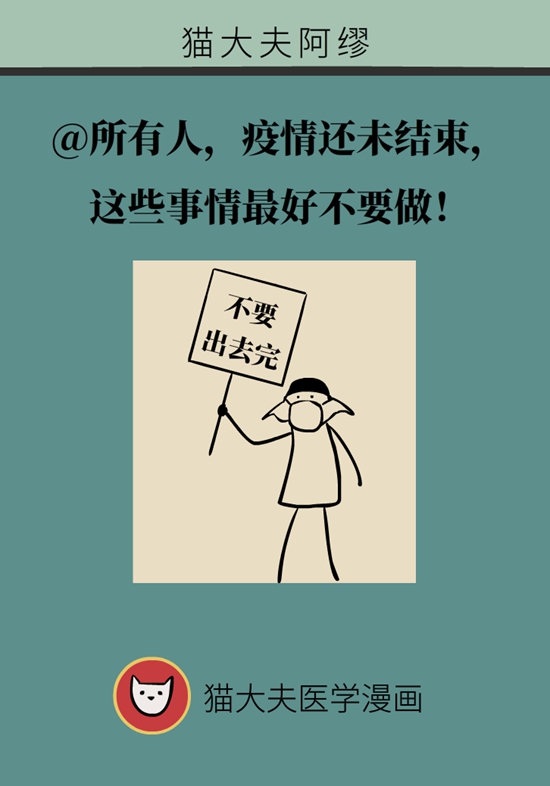 疫情还未结束 这些事情大家最好不要做 来源:内蒙古科普之窗 发布时间:2020-09-10 20:39 浏览次数: 次 【字体:小 大】 主审:首医附属北京天坛医院缪中荣“猫大夫医学漫画”供稿 终审:甘肃省科协信息中心采编部 【打印正文】