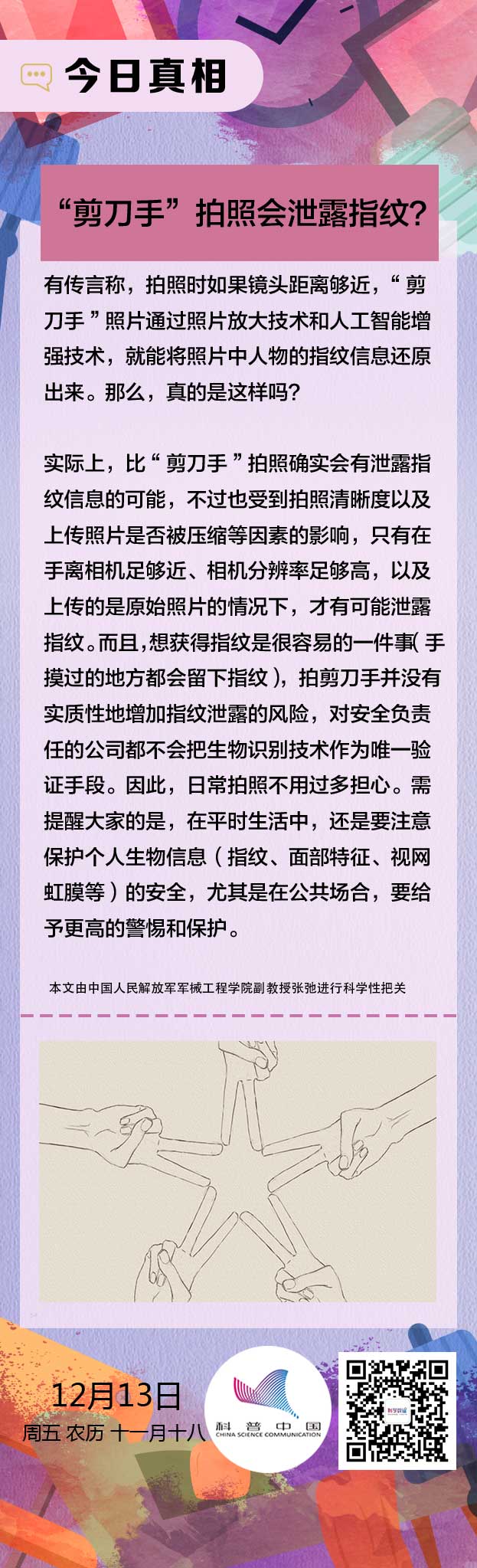 谣言:“剪刀手”拍照会泄露指纹? 来源:科学辟谣 发布时间:2020-01-23 11:27 浏览次数: 次 【字体:小 大】 比“剪刀手”拍照确实会有泄露指纹信息的可能,不过也受到拍照清晰度以及上传照片是否被压缩等因素的影响,只有在手离相机足够近、相机分辨率足够高,以及上传的是原始照片的情况下,才有可能泄露指纹。 终审:甘肃科协 【打印正文】