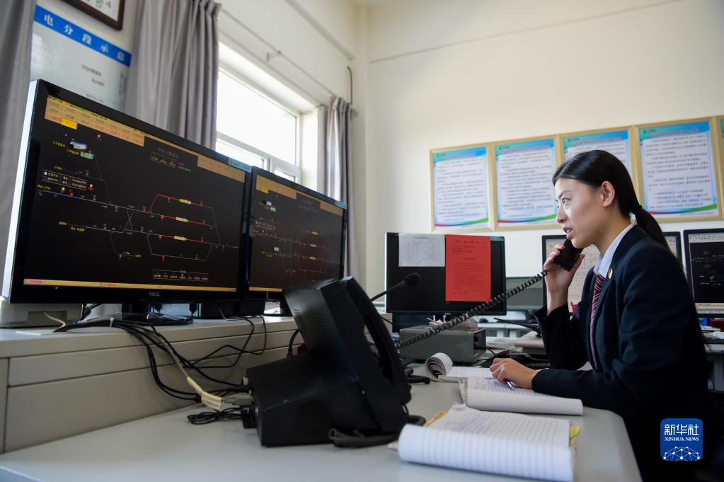 11月23日,在位于鄂尔多斯市的淮河能源西部煤电集团色连二矿罕台川集装站,工作人员在调度运煤列车。 新华社记者 朱文哲 摄