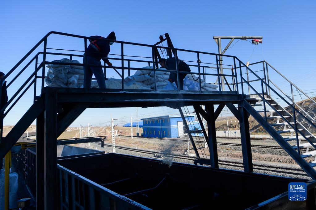 11月23日,在位于鄂尔多斯市的淮河能源西部煤电集团色连二矿罕台川集装站,工作人员在给运煤列车铺撒防冻粉。 新华社记者 李志鹏 摄