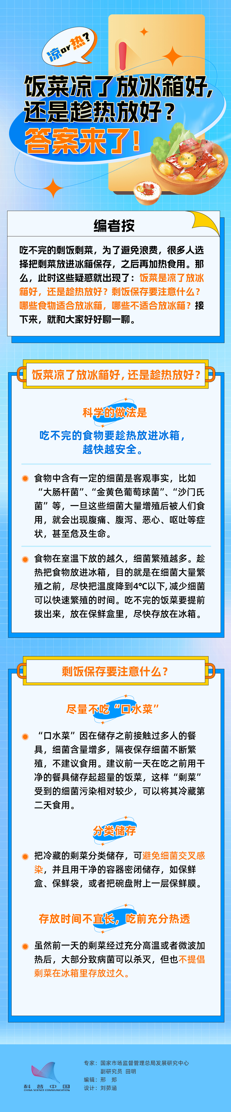 食品安全 | 饭菜凉了放冰箱好,还是趁热放好?答案来了! 作者: 来源:人民网科普 发布时间:2023-11-09 14:19:42 浏览次数: 次 【字体:小 大】 终审:甘肃省科协站群管理员 【打印正文】