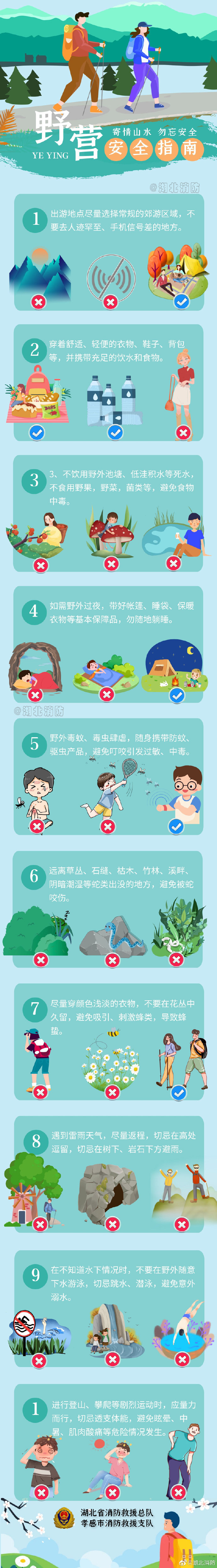 这份野营安全指南请收好! 来源:湖北消防 作者: 发布时间:2021-08-23 11:11:41 浏览次数: 次 【字体:小 大】 初秋出游正当时,驴友们野营地多远离城市,比较偏远,物质条件差。亲近大自然虽好,但却有可能会面临各种不可预知的危险。那么我们如何保证自身的安全呢? 终审:甘肃省科协信息中心采编部 【打印正文】